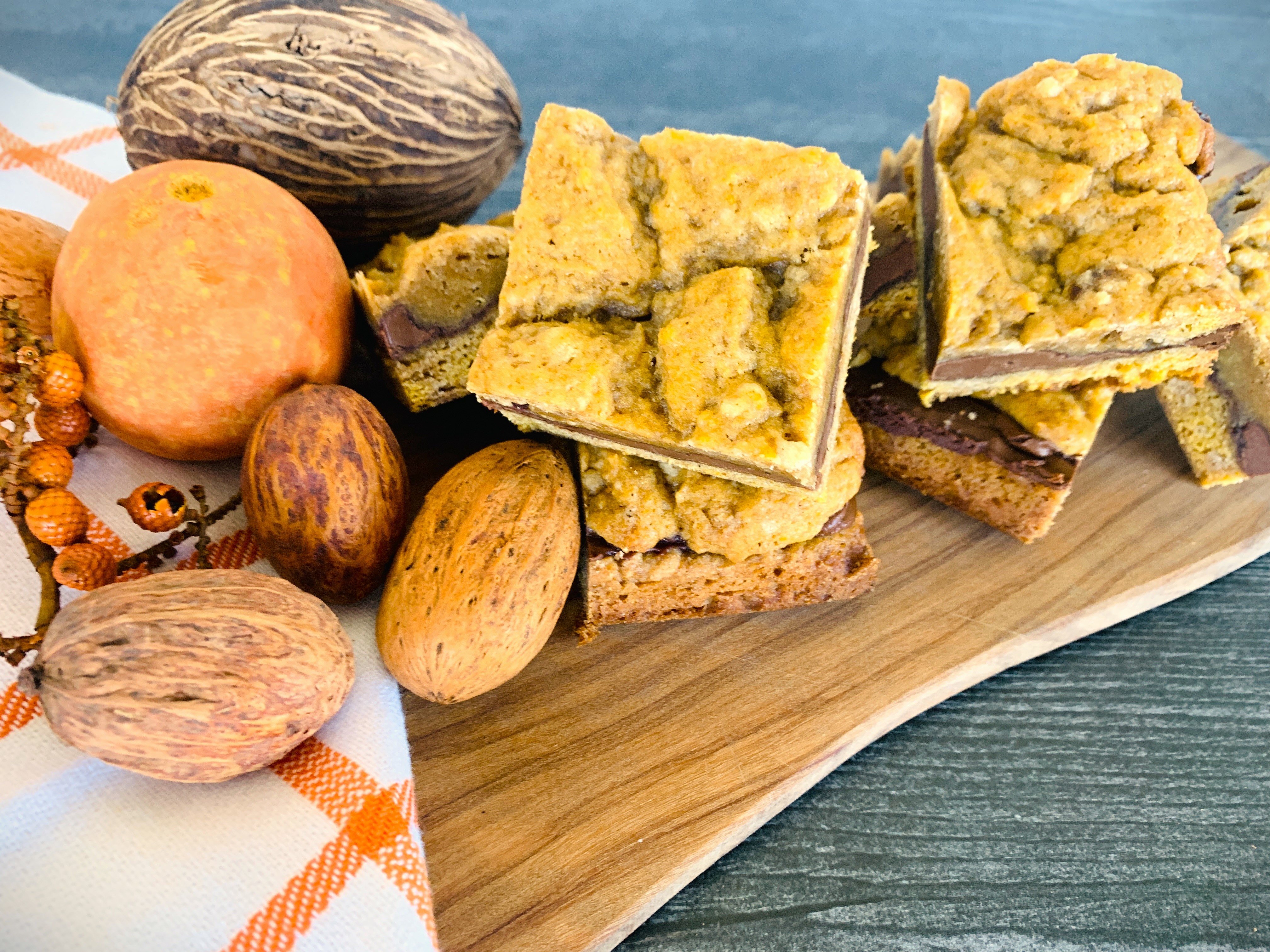 The dough is representative of a classic cookie recipe, buttery soft, and I folded the pumpkin puree in by hand at the end to prevent over mixing.  Half the dough is pressed into the bottom of the pan, and then par-baked, while the other half of dough is dotted on top of the Nutella spread.  The results are a soft and chewy cookie bar with both pumpkin and chocolate notes.  A terrific treat for the upcoming months.