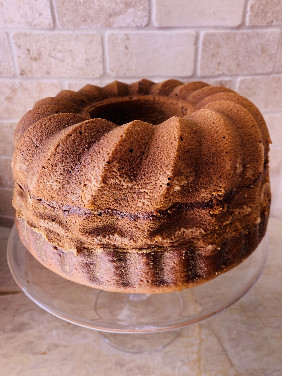 - Bake in oven for 55-60 minutes or until toothpick comes clean. Remove cake from oven and let cool for 45 minutes. Loosen edges and center with knife and invert on a cake plate. Let cool to room temperature.