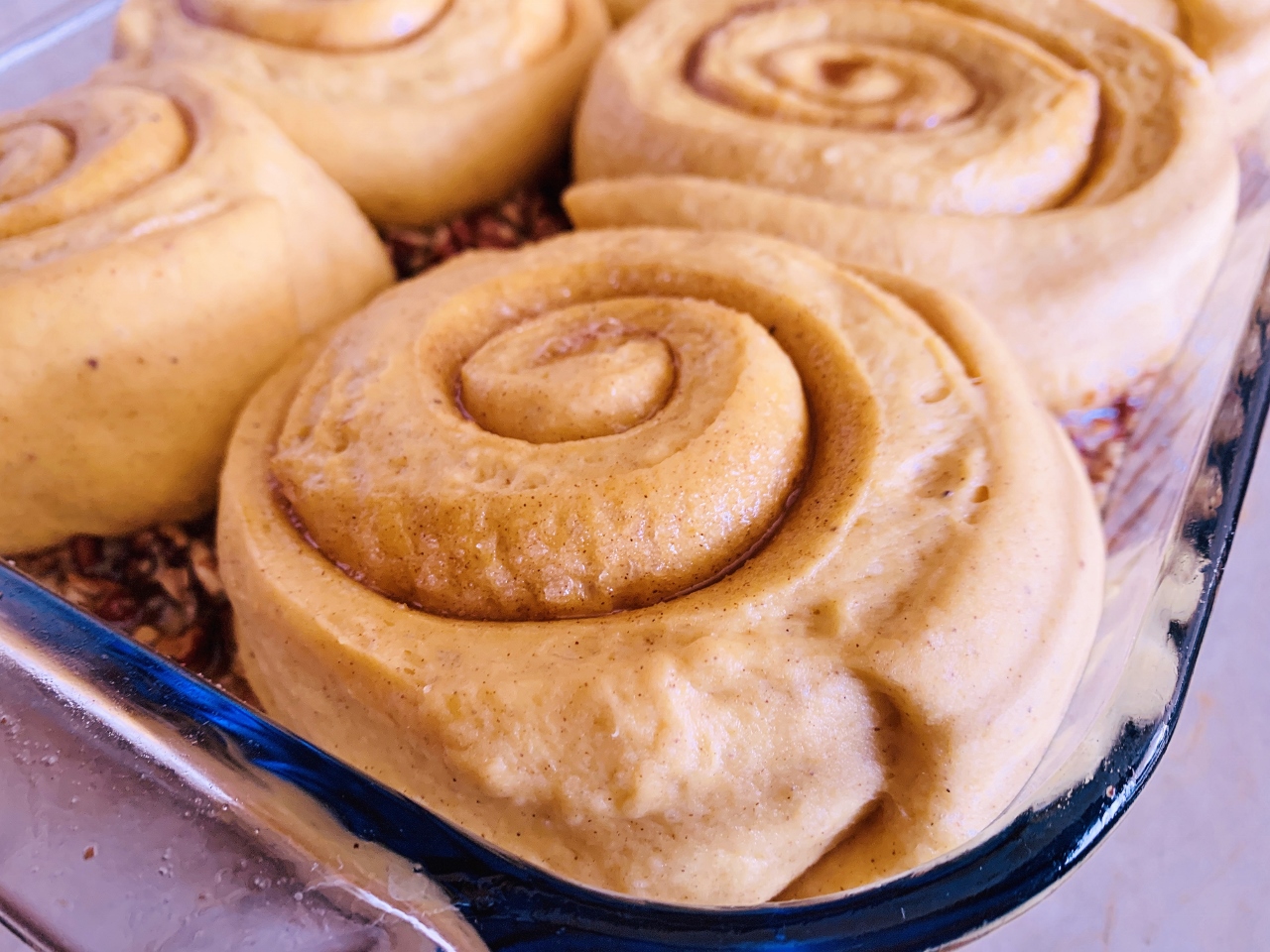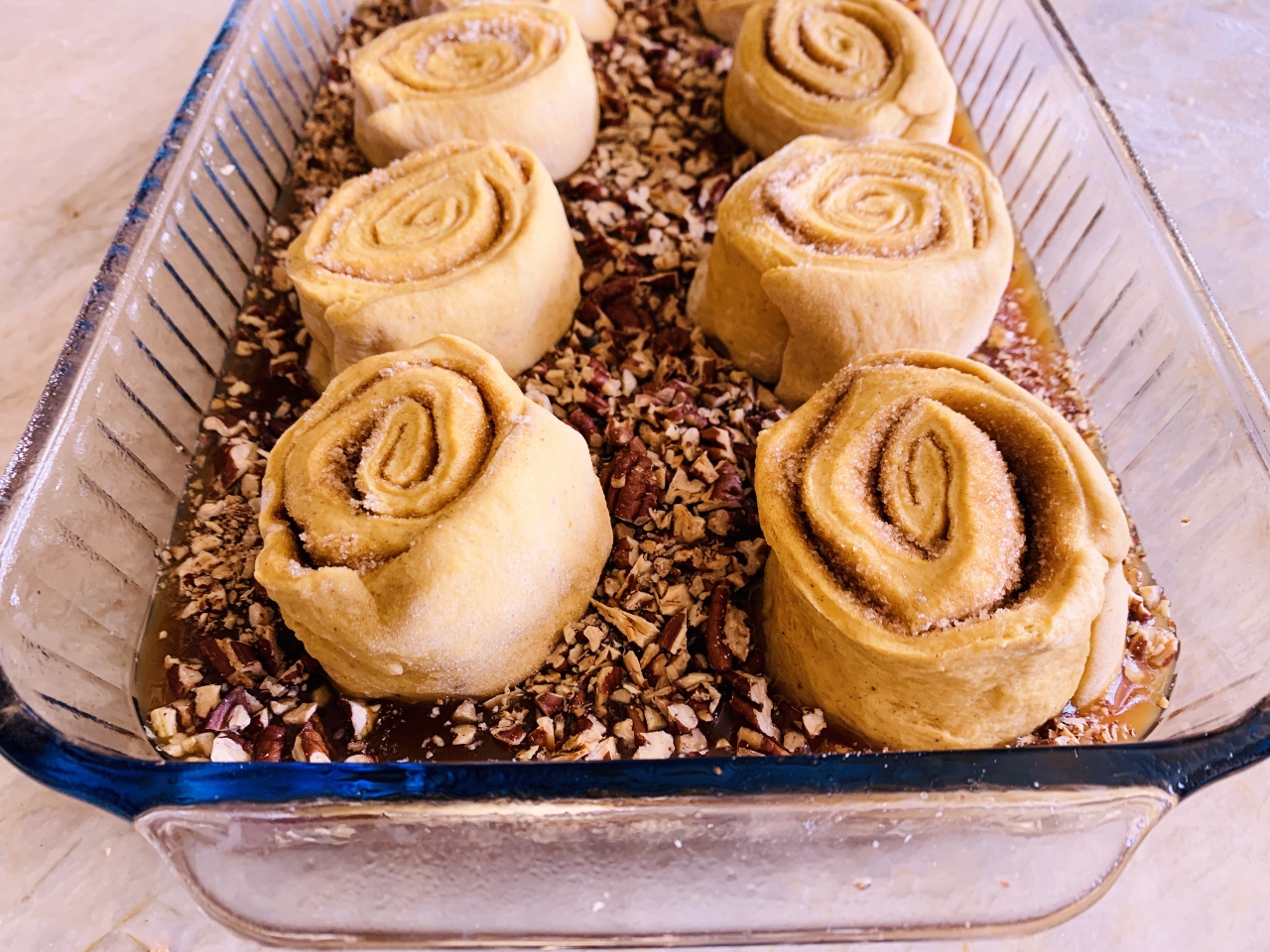 - Pour Sticky Syrup into a greased 13 x 9 casserole dish and sprinkle pecans on top. Place each roll on top of syrup, several inches apart (2 rolls per row). Cover dish with plastic wrap and proof in a warm dry place for 2 hours. *Proofing tips – use a heating pad with kitchen towel cover, to warm dish slowly, or place in a gas pilot lit oven, or place in a sunny window wrapped in a towel.
