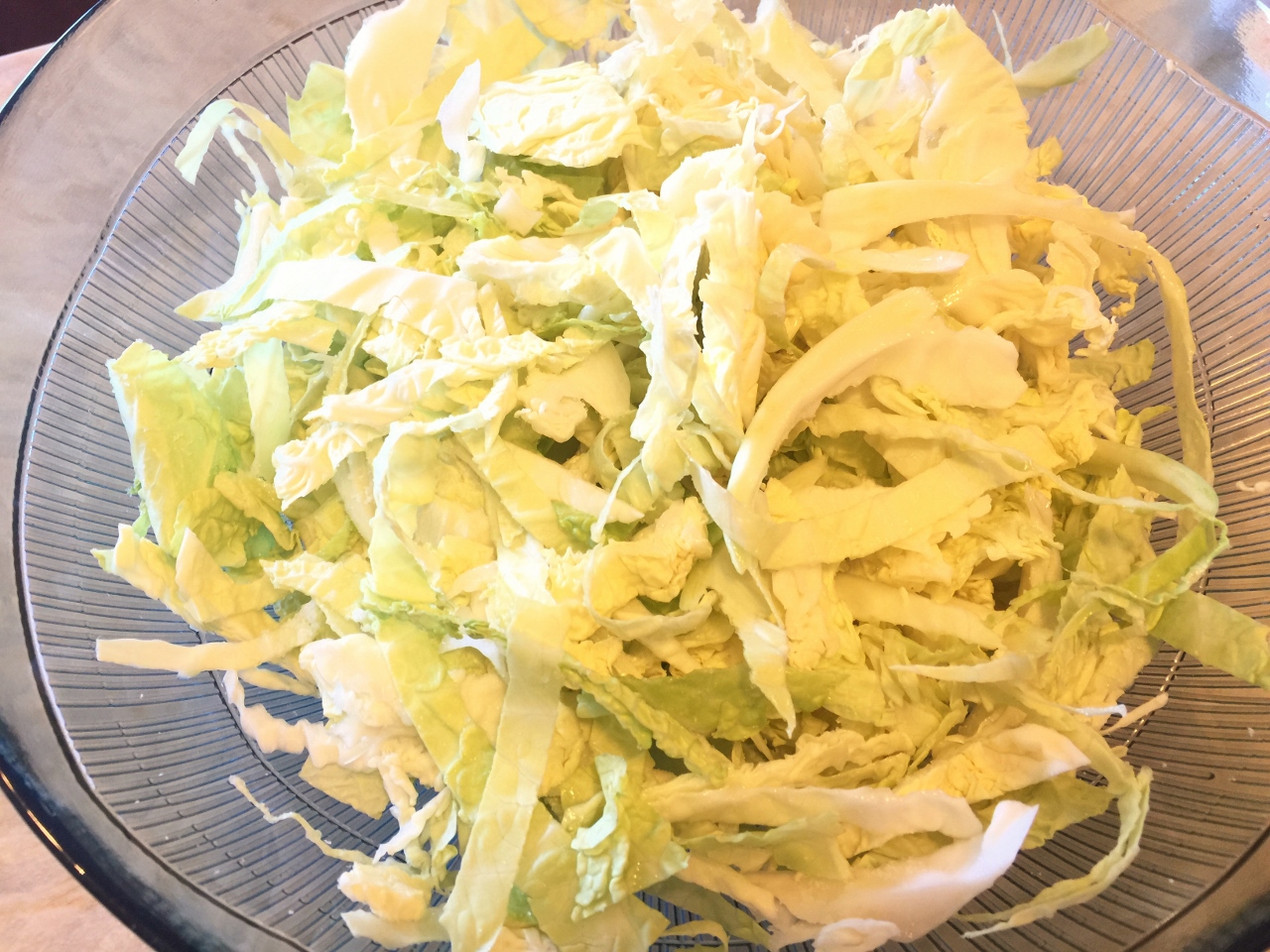 1. Slice cabbage and place in a large bowl. Sprinkle salt over cabbage and toss to coat. Let cabbage rest for 1 1/2 hours.