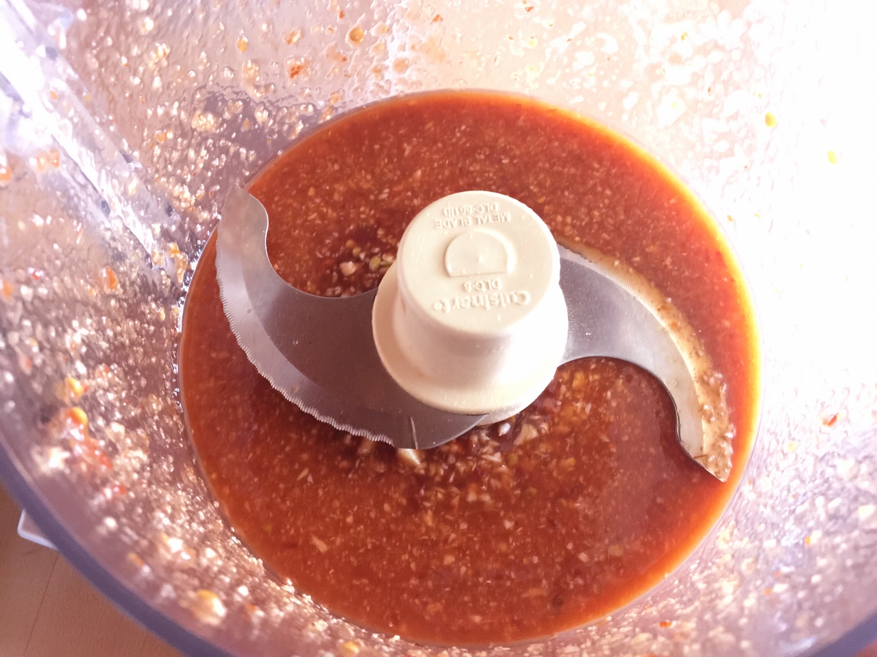 3. In a food processor, add garlic, ginger, fish sauce, chili paste, sugar and rice vinegar, puree until smooth.