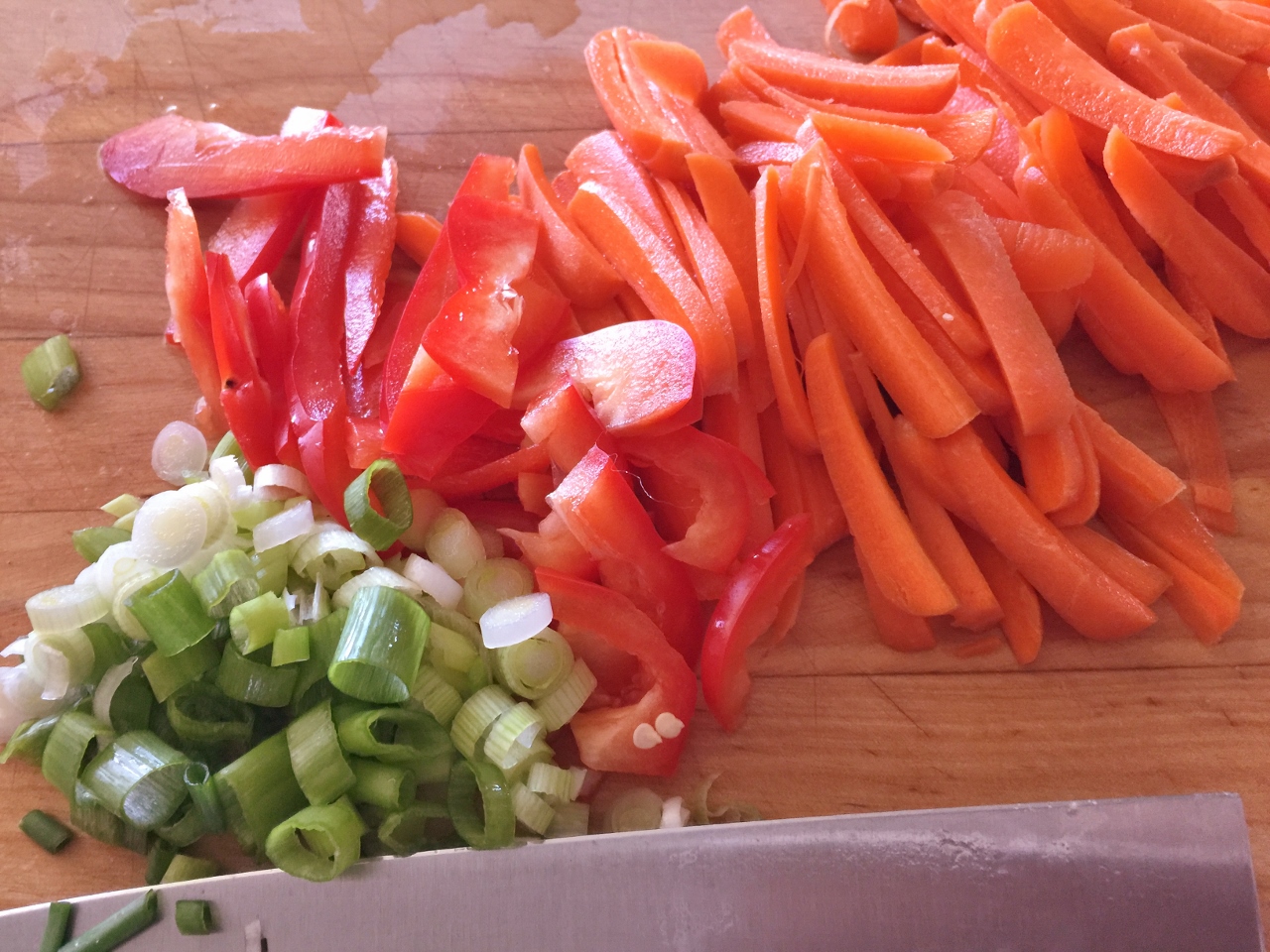 2. Place cabbage in a colander and rinse to remove salt. Place cabbage back into bowl. Slice carrots, onions and bell pepper, set aside.