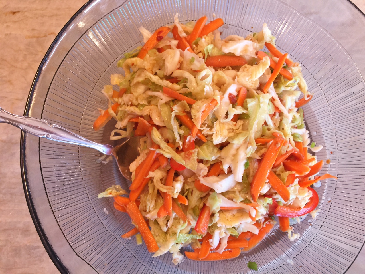 2. Place cabbage in a colander and rinse to remove salt. Place cabbage back into bowl. Slice carrots, onions and bell pepper, set aside.