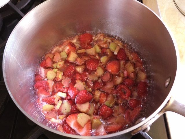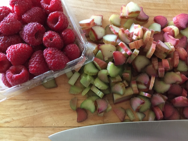 1. Slice rhubarb into 1/2 inch thick pieces and wash raspberries. Place them both into a medium pot, along with sugar and 1 cup of water. Cook over medium heat, stirring occasionally for 20 minutes, or until the liquid is reduced by half.