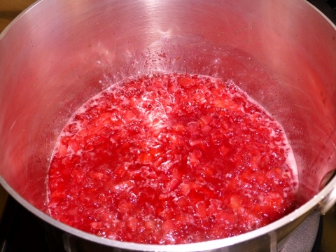 1. Slice rhubarb in 1/4 inch pieces, and rough chop into pieces.