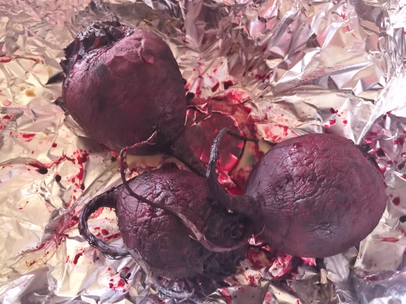 1. Preheat oven to 400 degrees.  Place beets in foil and drizzle with 2 teaspoons olive oil.  Wrap beets tightly and roast in oven for 1 hour.  Insert knife to make sure they are tender.  Remove and let cool. This can be done, one day ahead and chilled in refrigerator.