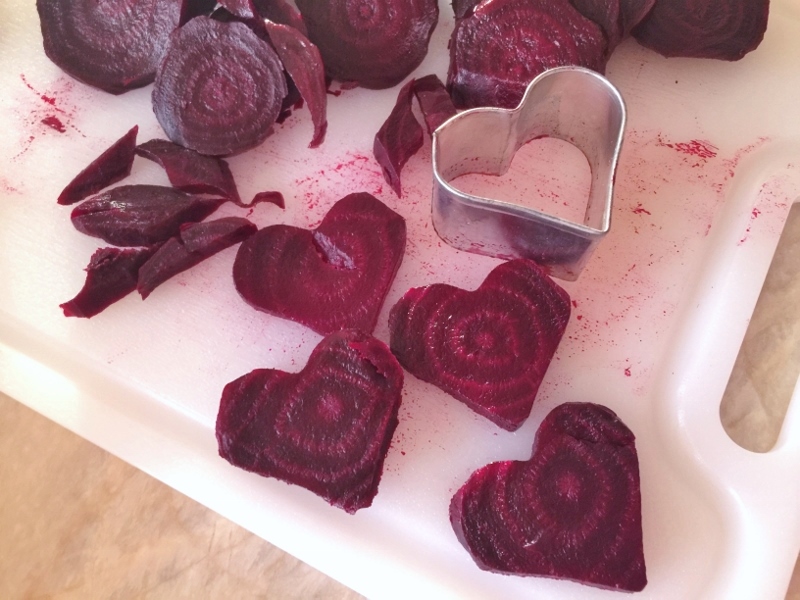 2.  Using a paring knife, peel beets and cut into 1/4 inch thick slices horizontally.  Using a small heart-shaped cookie cutter, cut through each beet, set aside.