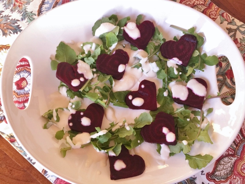 Valentine’s Day is at the end of the week, and for most of us, we’re staying home and cooking, like I do most years anyway.  It’s fun to create heart-shaped foods on the plate and beets can be transformed by using a cookie cutter to slice through them.  The softened beets creates a simple symbol of love, and quite fun to place with a few peppery arugula leaves.