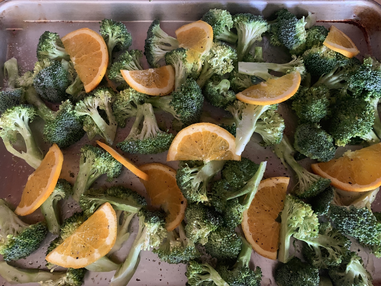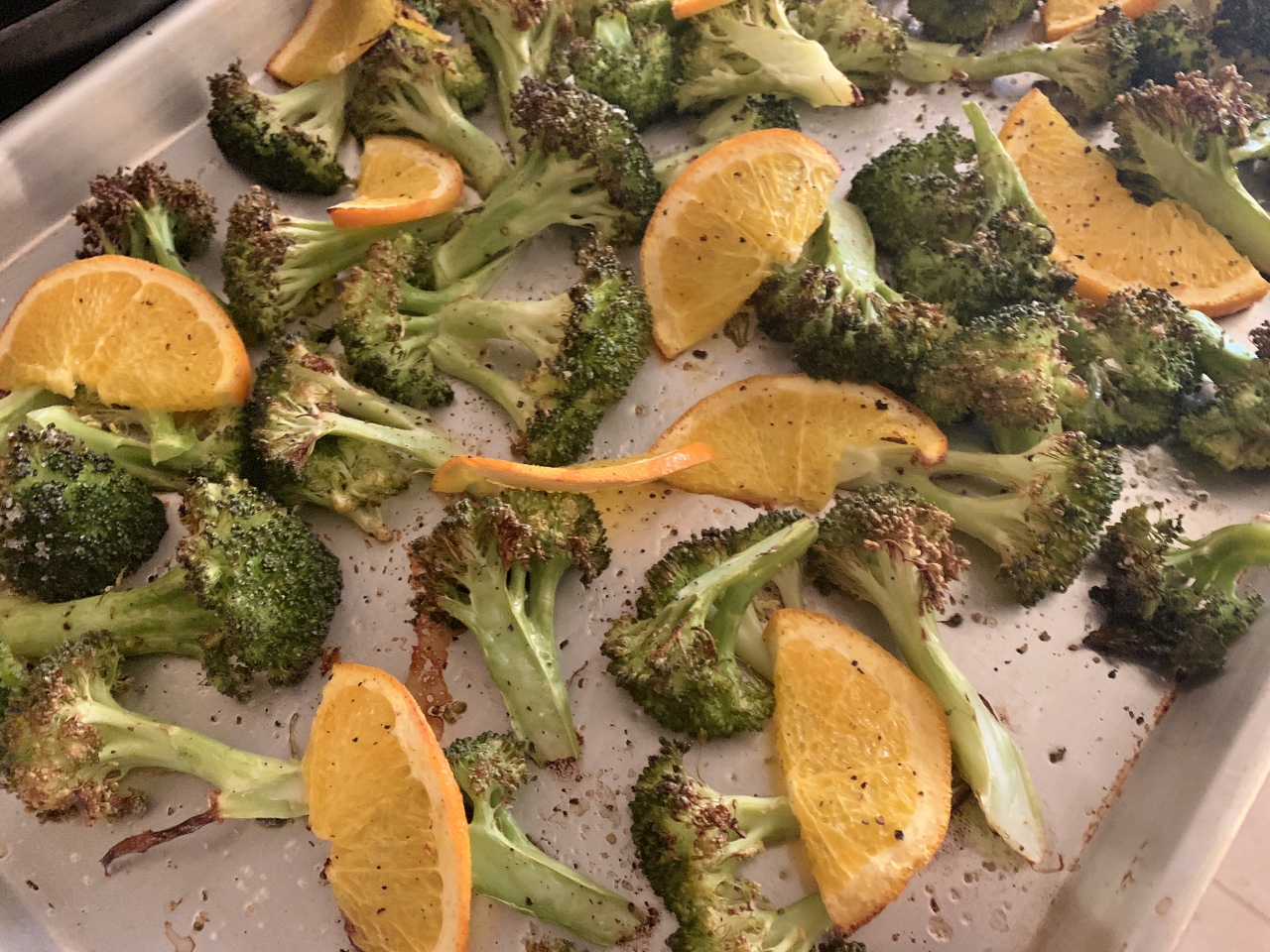 Broccoli makes a great side dish on any table and with a little fresh fruit, it’s even better. After roasting, broccoli turns a darker hue and its edges blackish. The caramelization that goes on in the roasting process is almost magical and fruit, like oranges, follow suit – the rind almost crimson at times and the sweetness deepens.