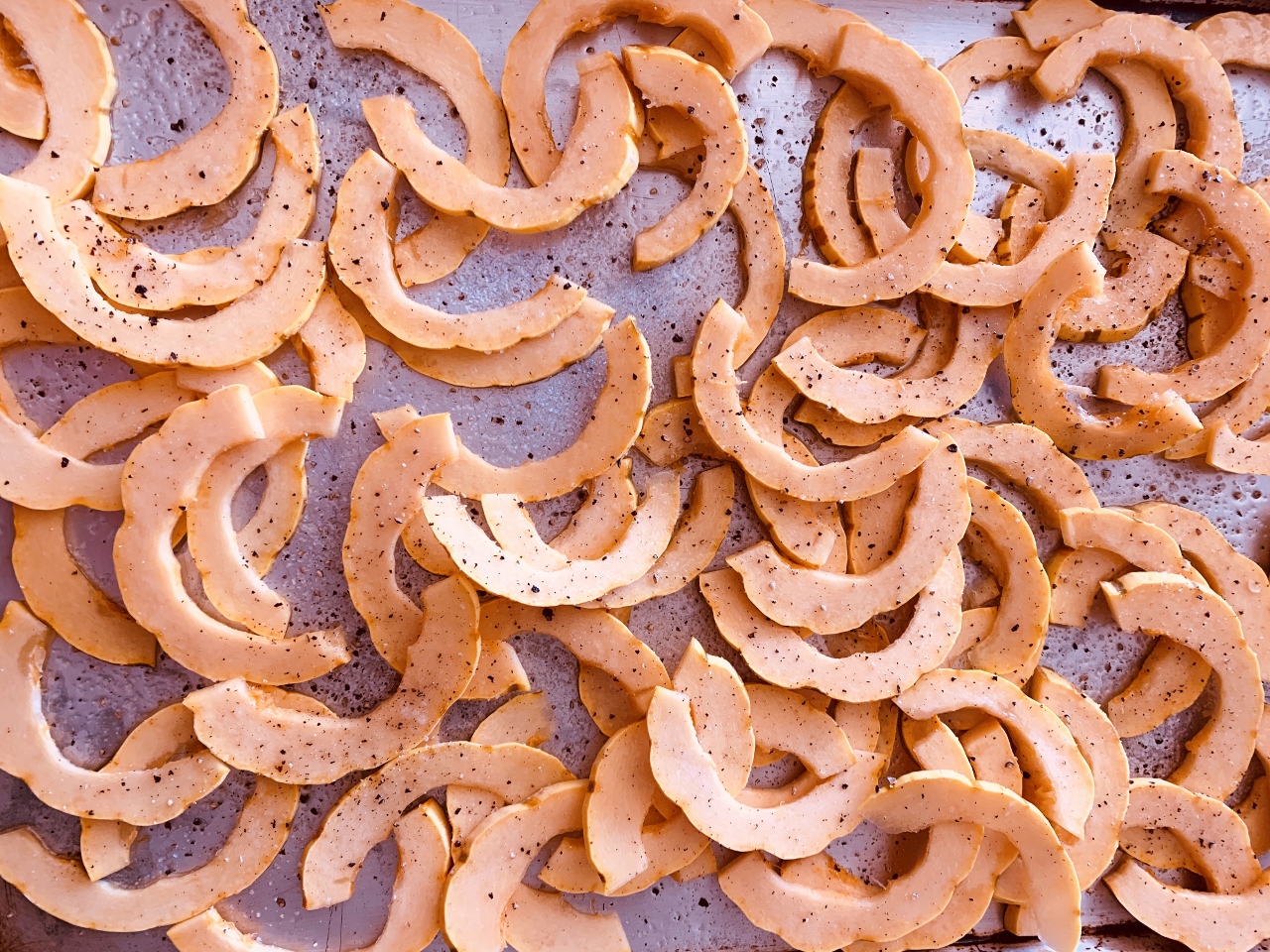 Butternut Squash is probably the most familiar in the squash family, but Delicata Squash has a unique taste and you can cook it with the skin on. Slicing Delicata is also not so difficult to do because it’s a bit more tender, making it easier to glide your knife right through its skin. This striped yellow squash crisps up in the oven is a short amount of time, while still keeping its magnificent color. It brightens a bowl of dark peppery greens brilliantly.