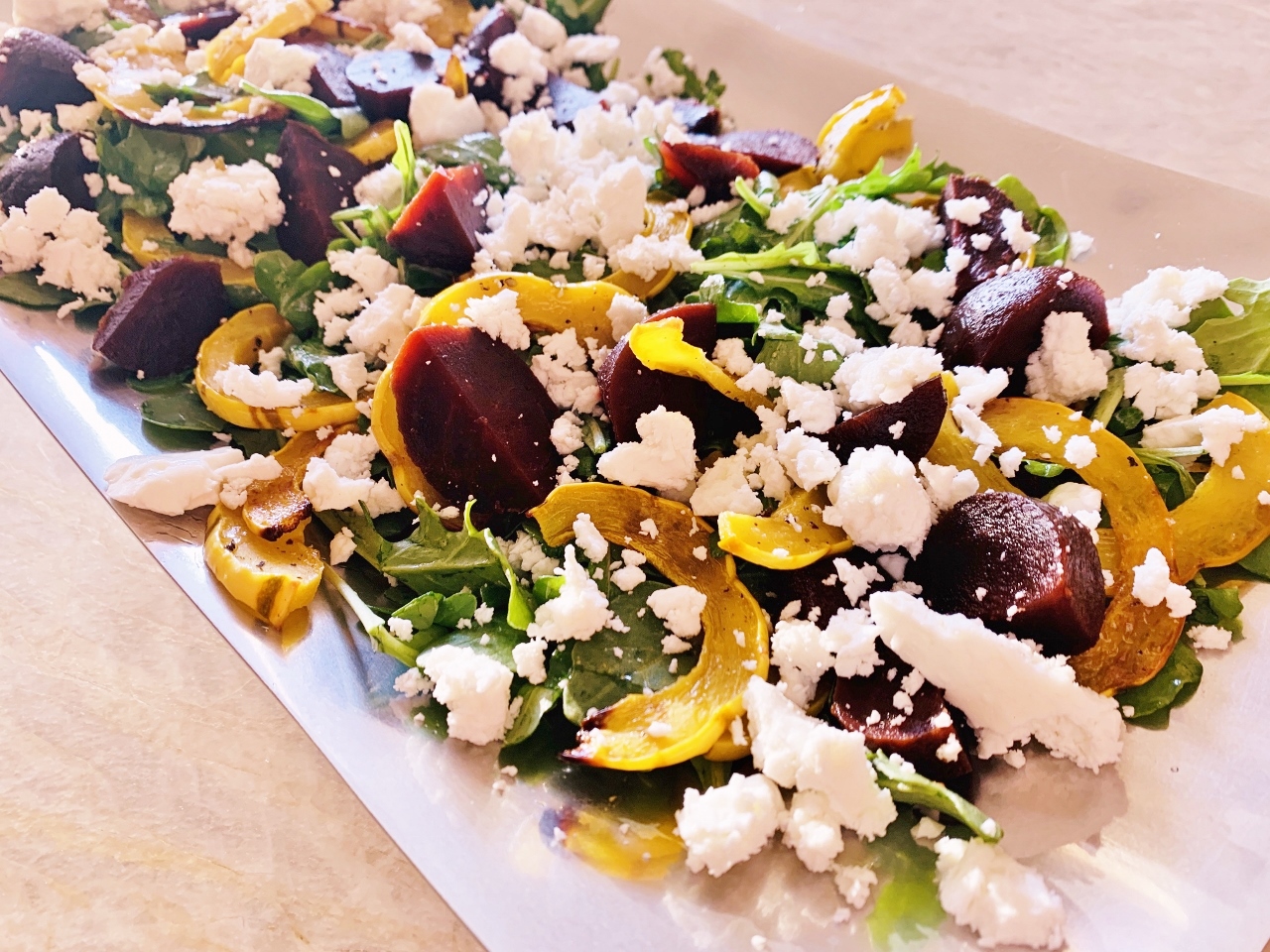 - In a jar with fitted lid, add vinaigrette ingredients – shake until combined. Place arugula in a bowl and drizzle with half of vinaigrette, toss. Place arugula on platter and top with beets and squash.