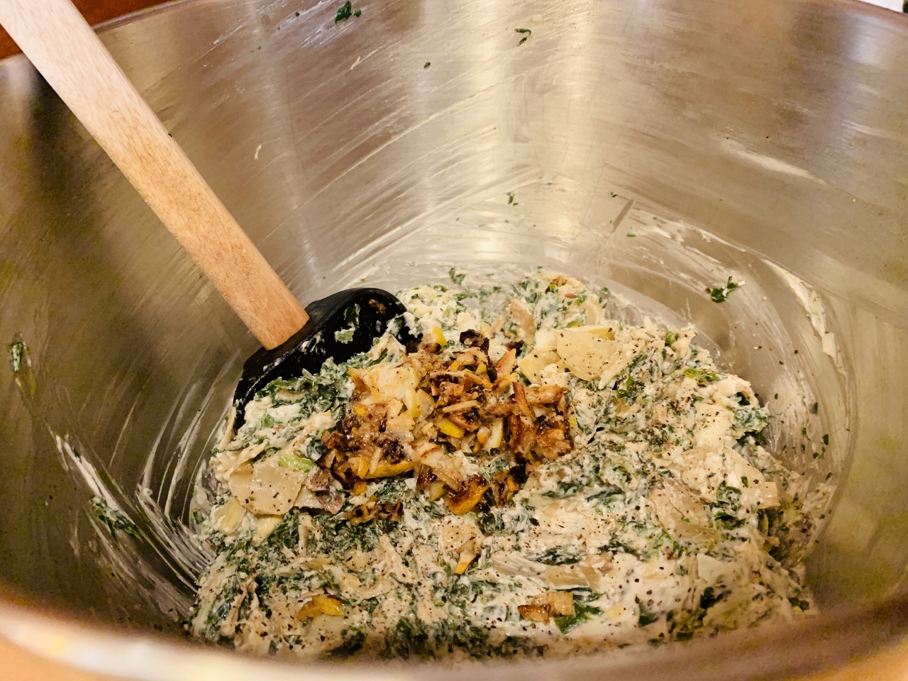 2. Squeeze water from spinach using a kitchen towel.  In a stand mixer or large bowl, add spinach, chopped artichokes, cream cheese, 1 1/2 cups grated cheese, Worcestershire, garlic powder, salt and pepper.  Mix on low until combined.
