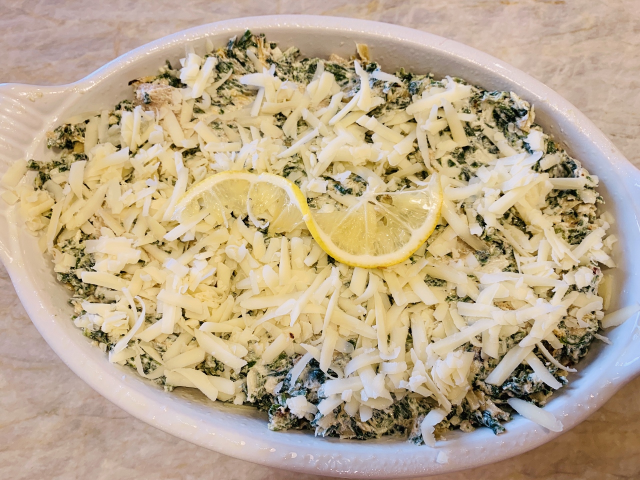 3. Mince roasted lemons and add to spinach mixture.  Mix by hand until incorporated.  Spoon dip into prepared dish and sprinkle with remaining cheese.  Top with fresh slice of lemon.