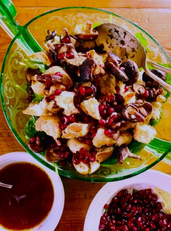 The vinaigrette is a mixture of fresh pomegranate juice, Dijon mustard and olive oil — simple ingredients that are easy to find or you already have in the pantry. Toss the dressing so the bread cubes absorb all those lovely flavors and soften just slightly. This salad can be an entree or a side dish and would be splendid on any occasion.