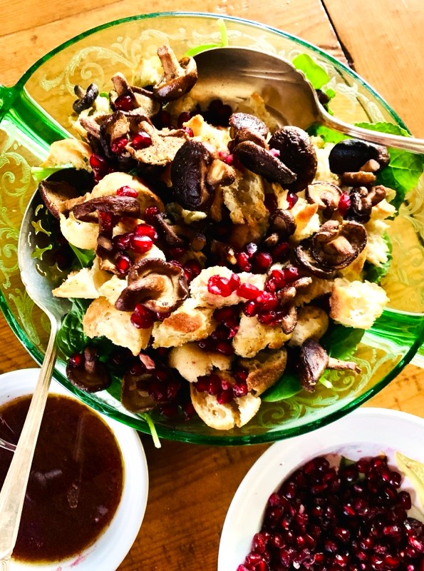 Salads in the fall and winter months are slightly hardier and filled with spectacular ingredients like spinach, roasted mushrooms and fresh pomegranate seeds. What makes this salad recipe so easy, is that you toast the bread cubes and roast the mushrooms at the same time in the oven on a sheet pan, and then layer them on top of greens when they are cool.