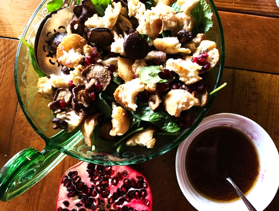 - Add spinach to a bowl and top with toasted bread cubes and mushrooms. Sprinkle 1/2 cup pomegranate seeds over top and toss salad with vinaigrette. Enjoy!