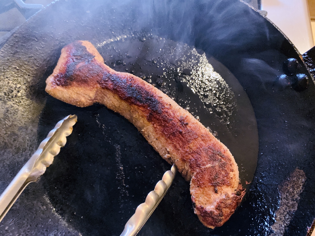 3. In an iron or metal skillet over high heat, add 2 teaspoons oil.  After 2 minutes, add pork and sear on all sides, about 8 minutes.  Remove and set aside.