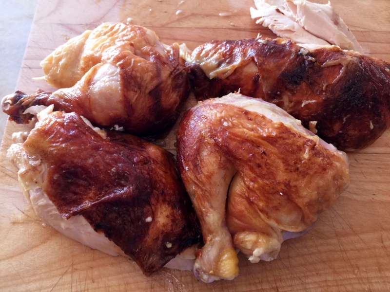 1.  Slice leg and thigh off bone with a sharp knife.  Slice two half breasts off of each side. Remove skin and shred all of chicken meat.  I like to use the carcass to make chicken broth, but if not, discard.