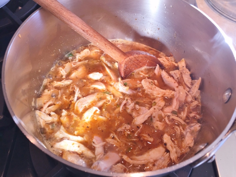 3.  Add chicken broth and stir to combine.  Add chicken and turn heat to medium-low, continue to cook chicken for 20 minutes or until all of broth has almost absorbed into meat.