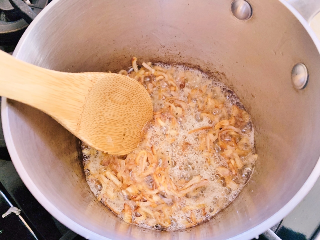 2. In a small pot or pan, add 1 tablespoon butter and sliced shallots.  Place over medium heat and cook for 15-20 minutes, stirring occasionally.