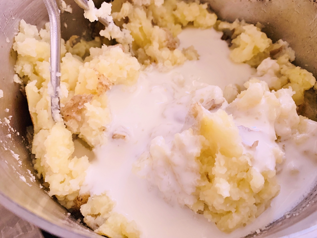 3. Drain potatoes and add remaining butter, mash.  Add buttermilk, olive oil, salt and pepper – mash until creamy.