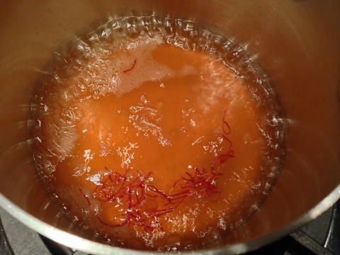 2. Next, add the saffron threads to the broth and let simmer for just 1 minute.