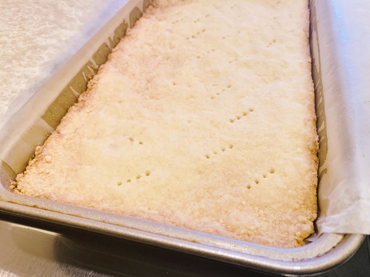 2. For Crust – In a stand mixer or bowl, cream together sugar and butter for 3 minutes.  Scrape down sides, add flour and salt.  Mix on low until coarse crumbs, remove bowl.  Dump crumbs into prepared pan, and press into bottom.  Prick dough with a fork in several places.  Bake in oven for 25 minutes, or until lightly golden brown.  Remove and cool.