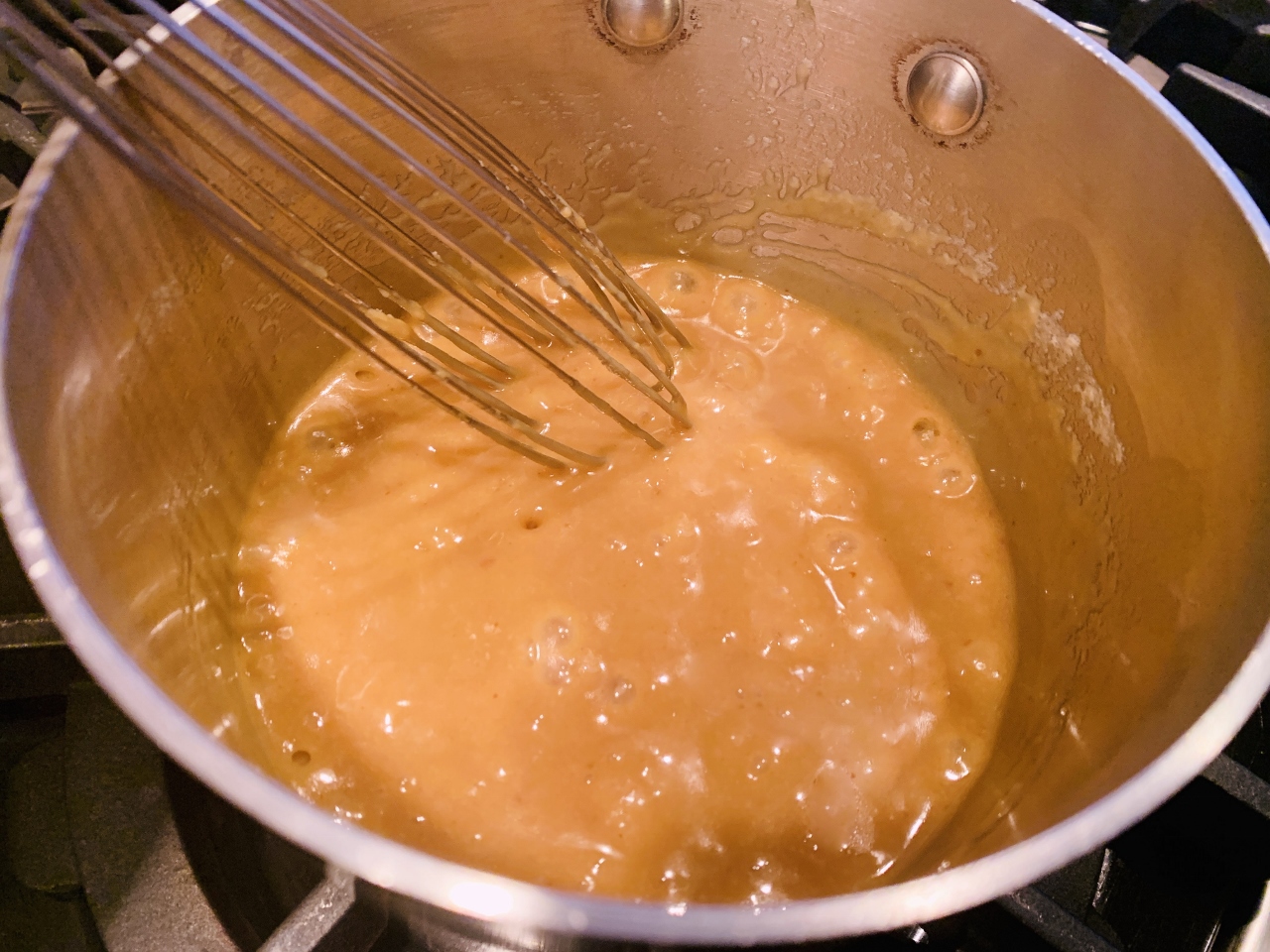 3. For Caramel Layer – In a saucepan, add brown sugar, condensed milk, and corn syrup.  Place over medium-low heat until melted.  Reduce heat to low and stir with a whisk constantly until thick and glossy, about 8-10 minutes (Be careful not to cook too high, or you will burn it).  Pour caramel over cooled crust, and sprinkle with salt.  Let rest for 1 hour.