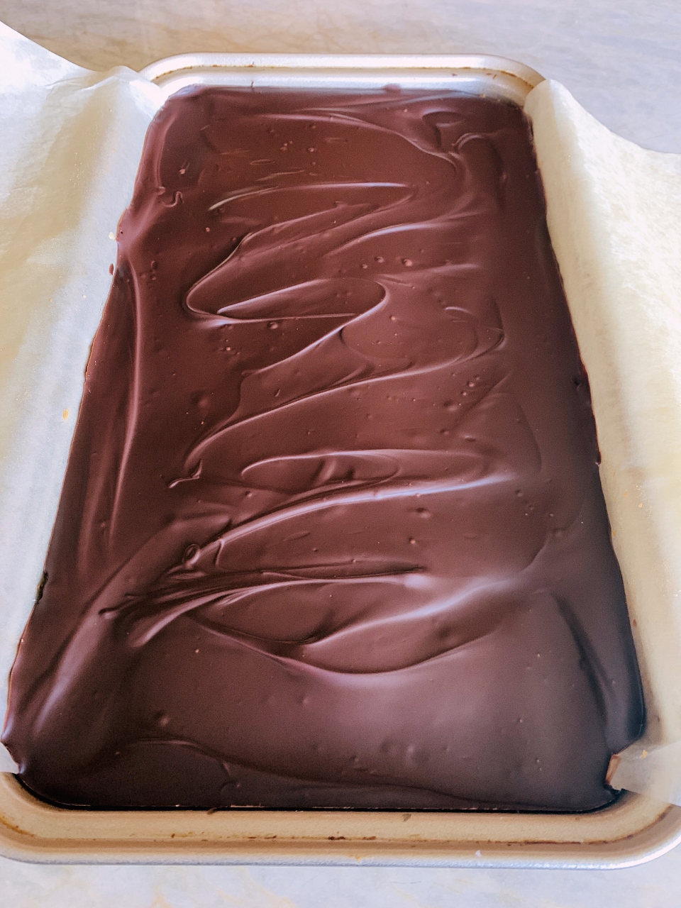 The base of the recipe is shortbread cookie dough, which after baking, gives these bars an incredibly delicate crust.  The crust is the only part of this cookie that you actually bake, and the middle layer is made on the stove top, and I used my microwave to melt the chocolate for the top.  I did take some liberties to make this recipe a little more user friendly.