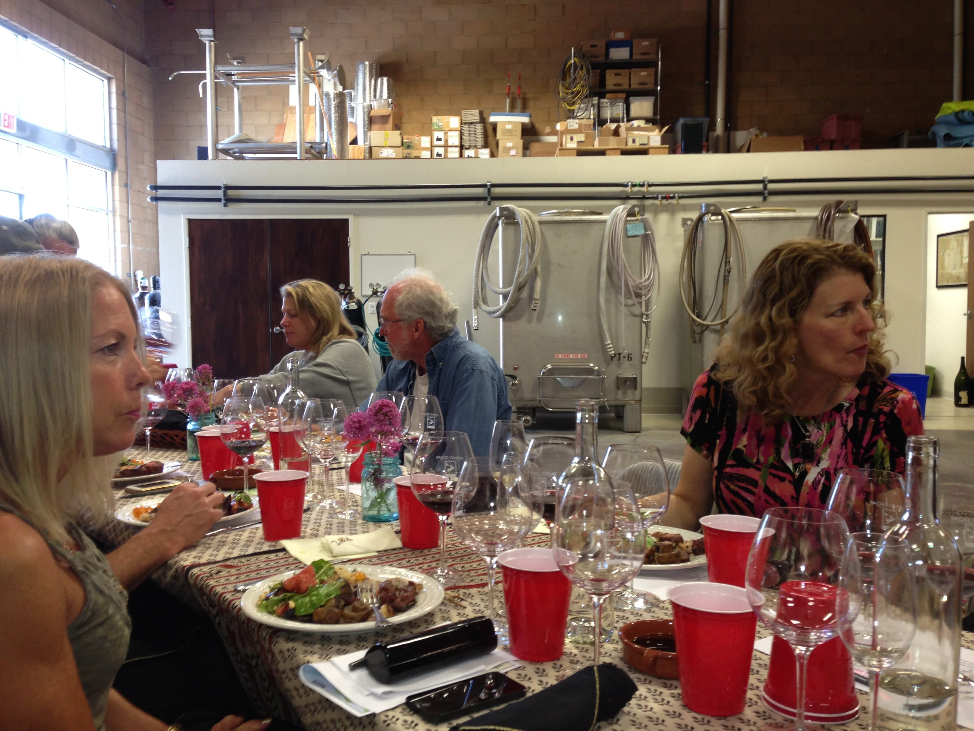 The tasting was paired with cheeses, flatbreads and salami that was provided by a local caterer followed by a sit down luncheon with chicken and beef kebabs and an array of fresh salads. The most interesting part of the tasting was that Norm, the winemaker, sampled the same clones of wine but, changed different variables such as the vineyard and barrel type which created many different flavors in the wine.