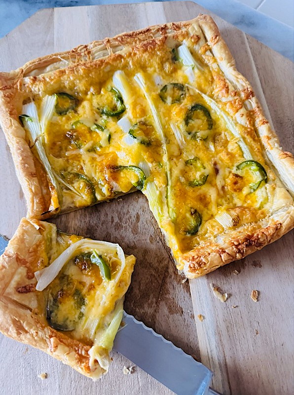 The ingredients I used are classic like sharp cheddar cheese, scallions or green onions as they are sometimes called, and jalapenos for a bit of personality.  The cheese tames the chilies, so no need to worry if it’s going to be too hot for your family and friends.  This Savory Cheddar Scallion Puff Pastry Tart is so satisfying and can be served for brunch, lunch or as an appetizer.