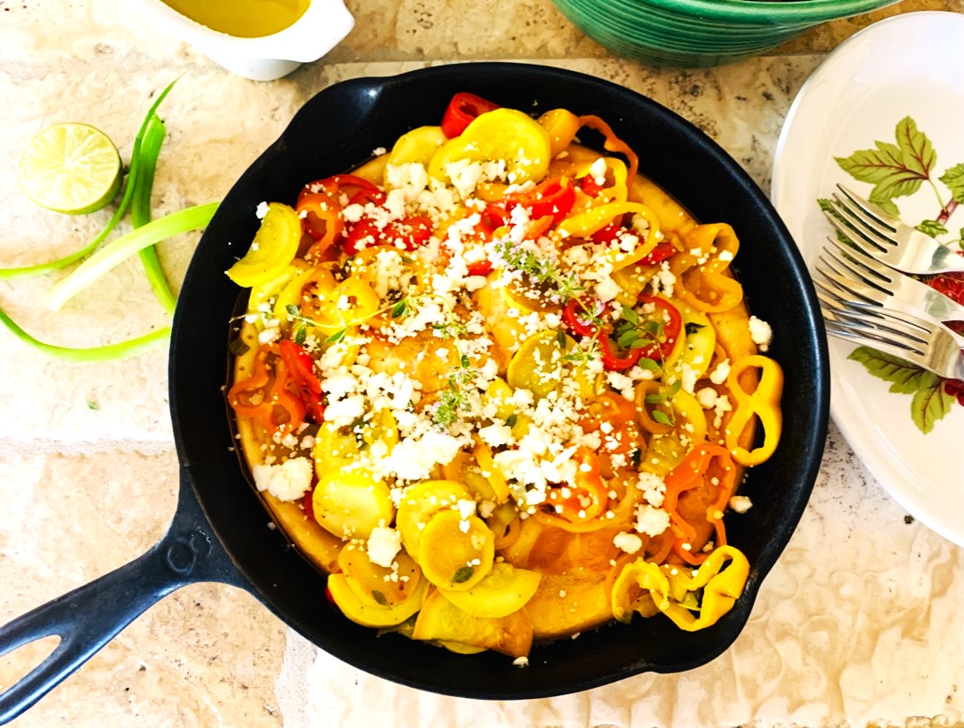 - Remove skillet from oven and top with sauteed vegetables. Sprinkle top with feta cheese and serve hot. Slice into wedges and enjoy!