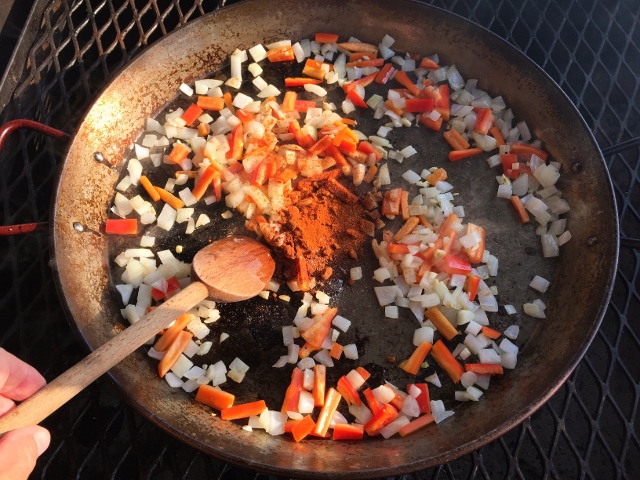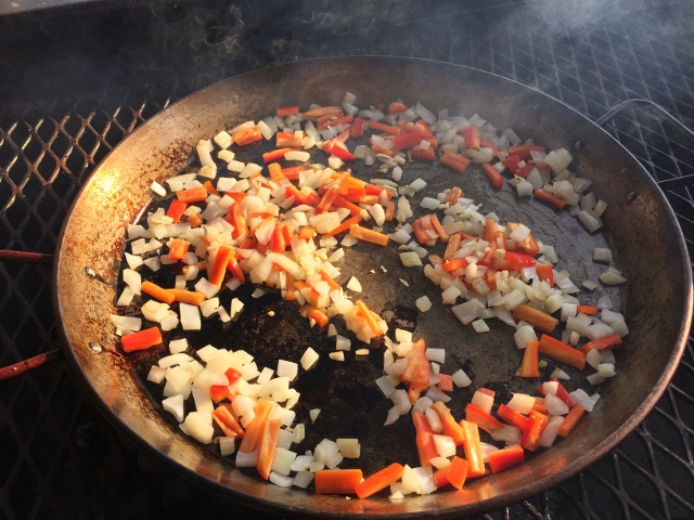 1. Prepare your charcoal or gas grill. If using gas, preheat to 375 degrees. Place pan on grill and drizzle with 1 tablespoon of olive oil. Add onion and cook for 2 minutes, while stirring. Then, add red pepper and garlic and continue to cook for 1 minute.