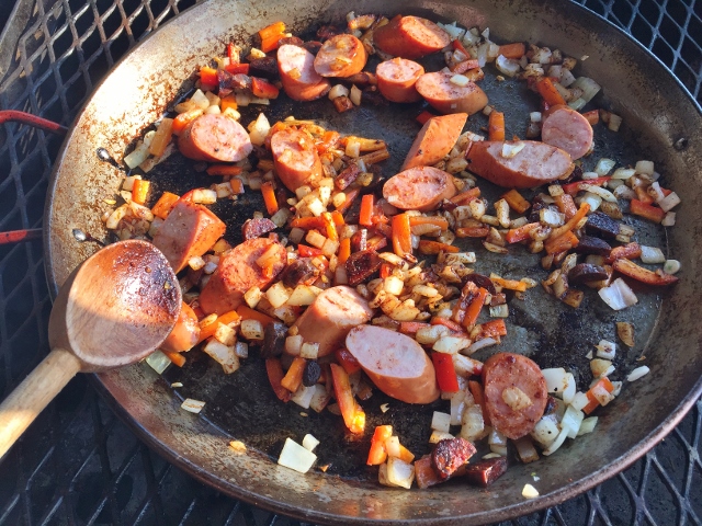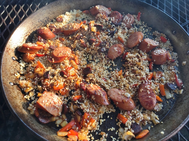 2. Add paprika, cayenne, salt and pepper and stir to combine, continue cooking for 1 minute. Add both sausages and cook for 2 minutes to release the flavors and caramelize slightly. Pour in the rice and spread out in the pan. Cook for 2 minutes to toast lightly.