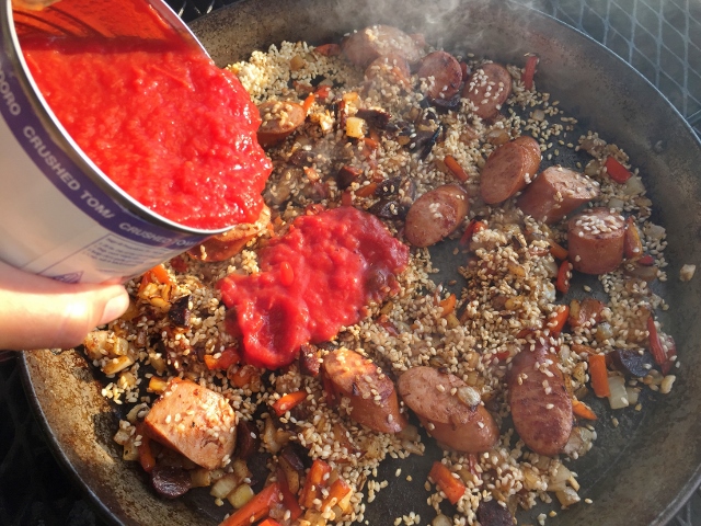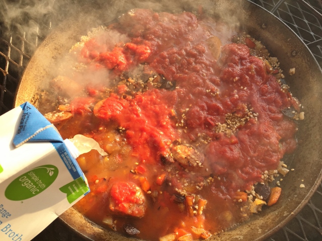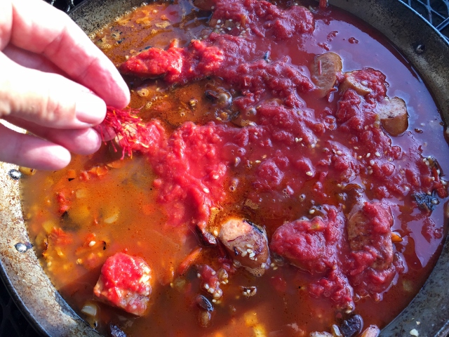 3. Pour in the tomatoes and chicken broth and stir to combine. Add the saffron and stir. Cover the pan with grill lid and cook for 20 minutes.