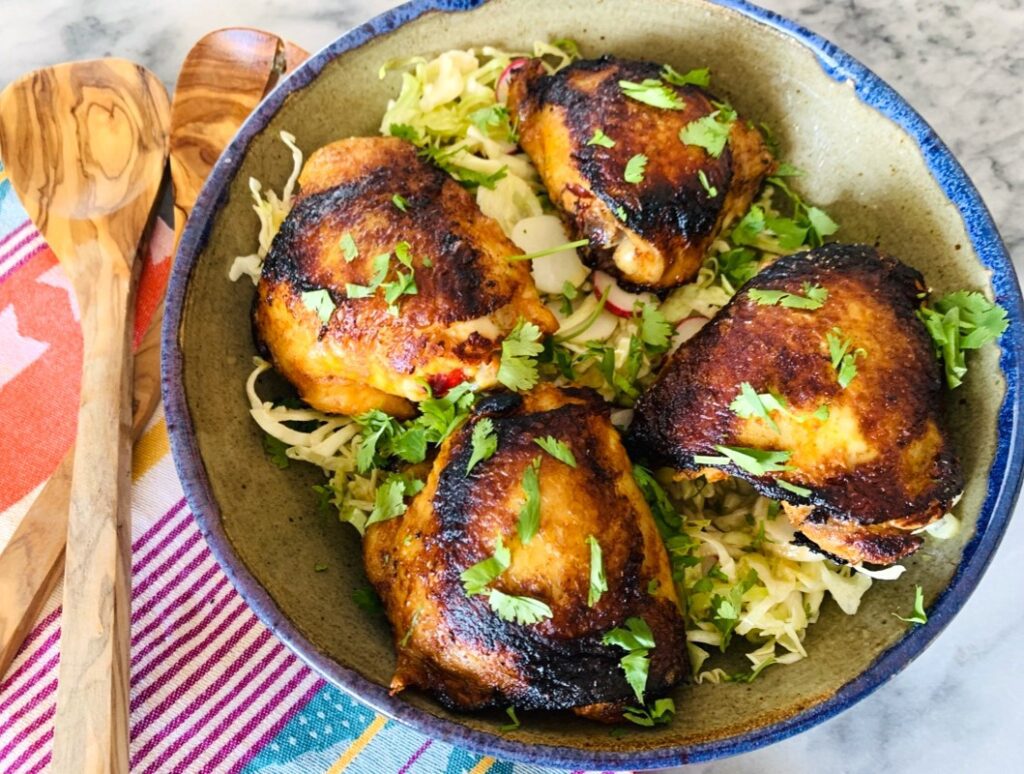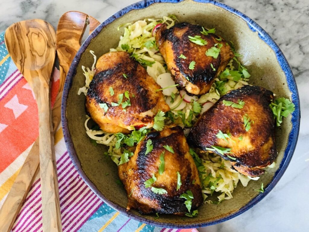 - Add cabbage, radishes, and green onions and toss. Top slaw with cooked chicken thighs and sprinkle with cilantro. Serve and Enjoy!