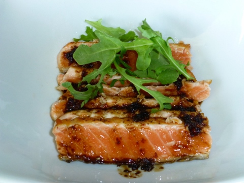 5. Place the slices of salmon on a plate lined up closely together and drizzle with the Ponzu sauce. Sprinkle the fish with fresh arugula. Enjoy!