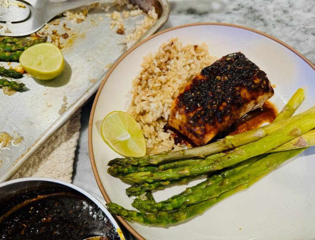 - Remove from oven and squeeze lime over asparagus. Add salmon, asparagus and rice to each dish and top remaining glaze over salmon. Enjoy!