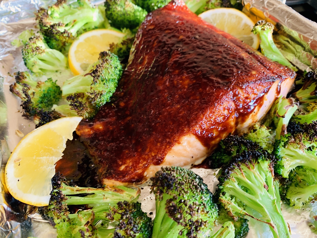 - After 5 minutes, remove sheet pan and spoon glaze over fish. You can use remaining glaze for dipping, or save for another meal. Place sheet pan back under broiler for 3-5 minutes, or until fish is done to your liking. Squeeze lemon over broccoli and serve immediately, Enjoy!