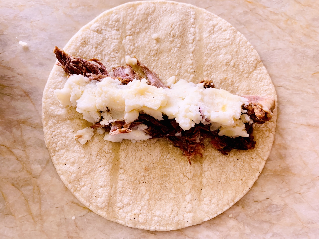 - Heat stack of tortillas in microwave for 20 seconds to make pliable. Place 1 tortilla on countertop, spoon beef and potatoes into center horizontally (see pic). Roll up and set aside, seam side down. Repeat until beef and potatoes are all gone.