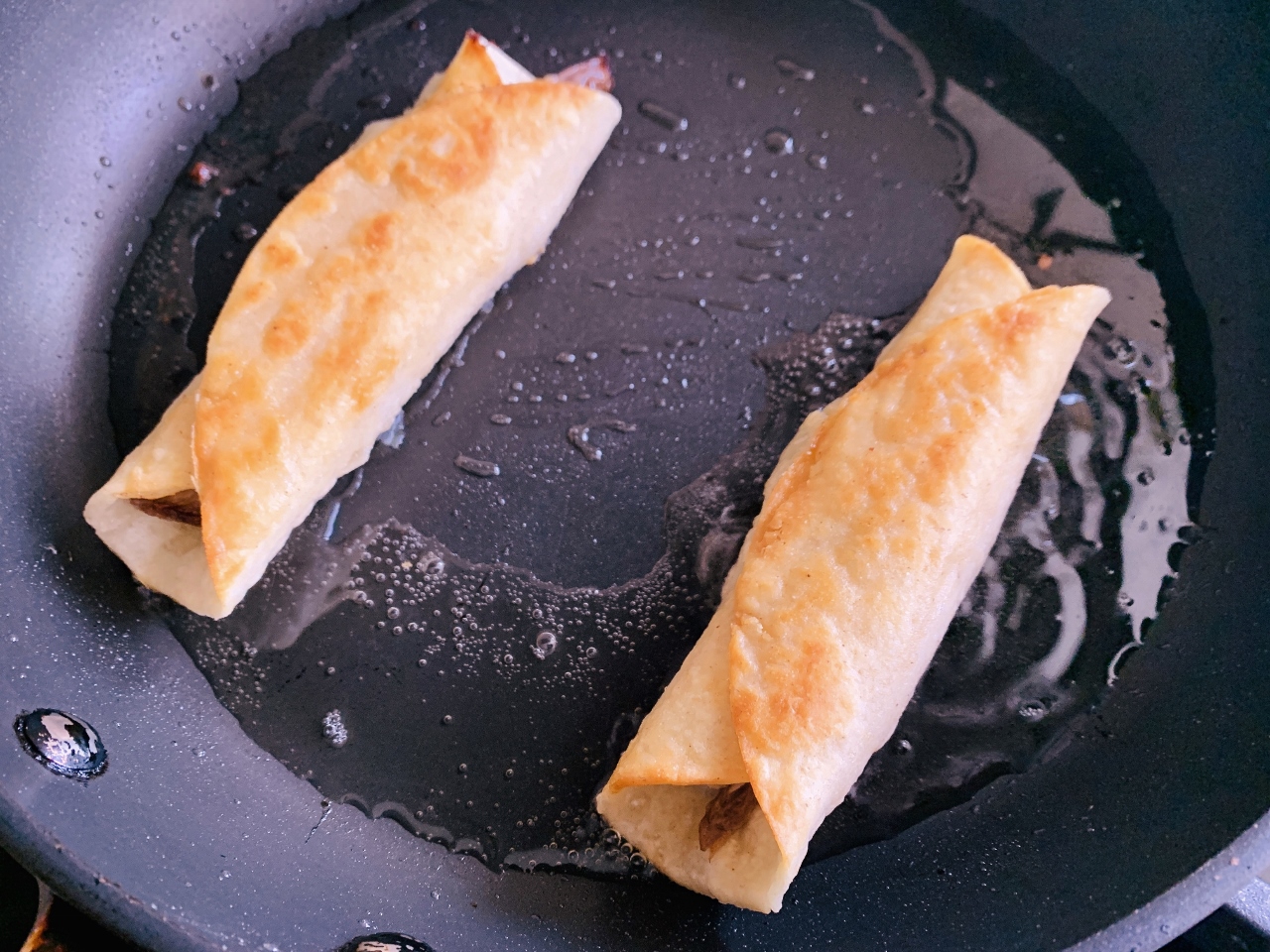 - In a sauté pan over medium heat, add 1/4 cup oil. After 2 minutes place 2 taquitos in pan. Brown on all sides, about 4 minutes. Remove and place on a paper towel lined plate. Repeat until all taquitos are golden brown. You may need to add more oil to pan, in between batches.