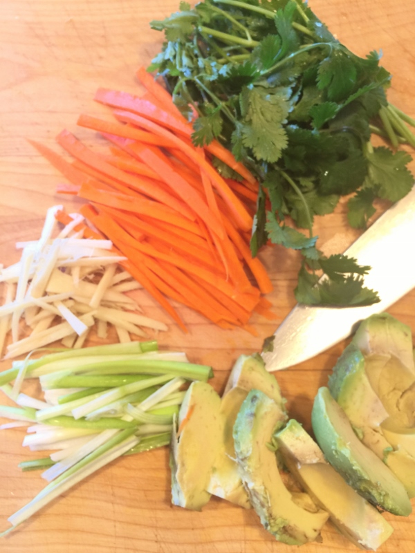 2. Peel and julienne the carrot and ginger. **To julienne you square off the sides of the vegetable using your knife and slice into thin strips. Cut the scallion and avocado into thin slices.