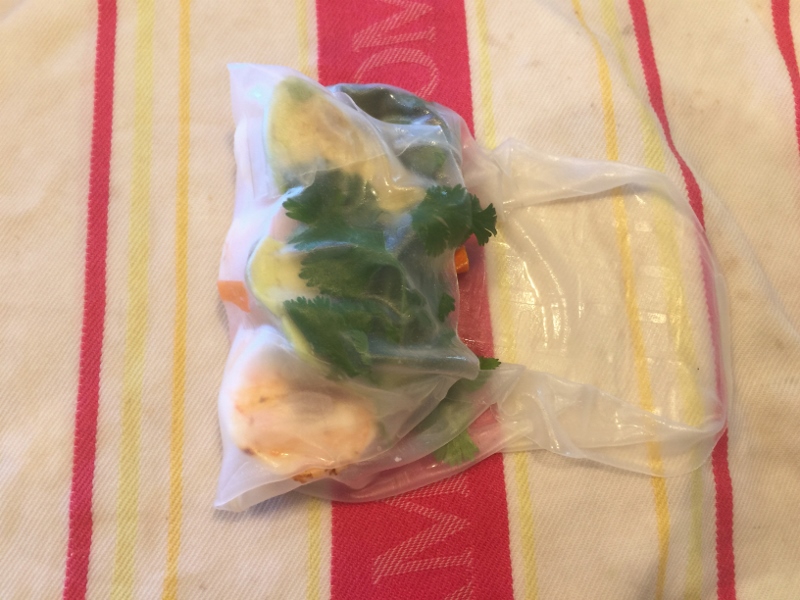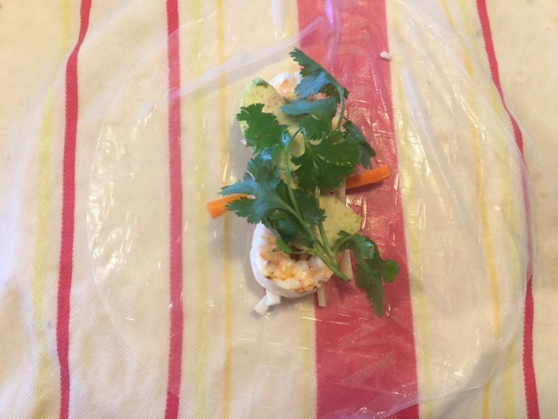 2. Remove spring roll wrappers from the bag and soak, one at a time, in a bowl of water for 20 seconds. Place the wrapper on a damp kitchen towel and layer 3 shrimp, 2 slices avocado, julienne carrots, ginger, scallions and sprig of cilantro on top.