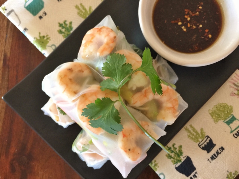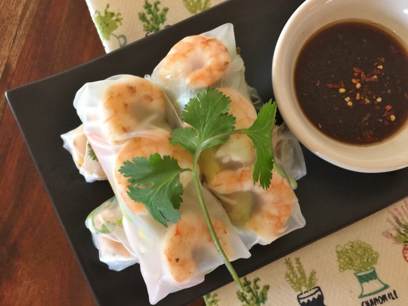 Spring rolls are traditionally from Southeast Asia and are either fried or served fresh with seafood and/or vegetables. I tend to love the freshly rolled rice wrappers because of their delicate nature – you can actually taste the ingredients inside. My recipe for Shrimp & Avocado Spring Rolls are light, but truly satisfying because of the creamy sliced avocado and the crunchy julienne veggies.