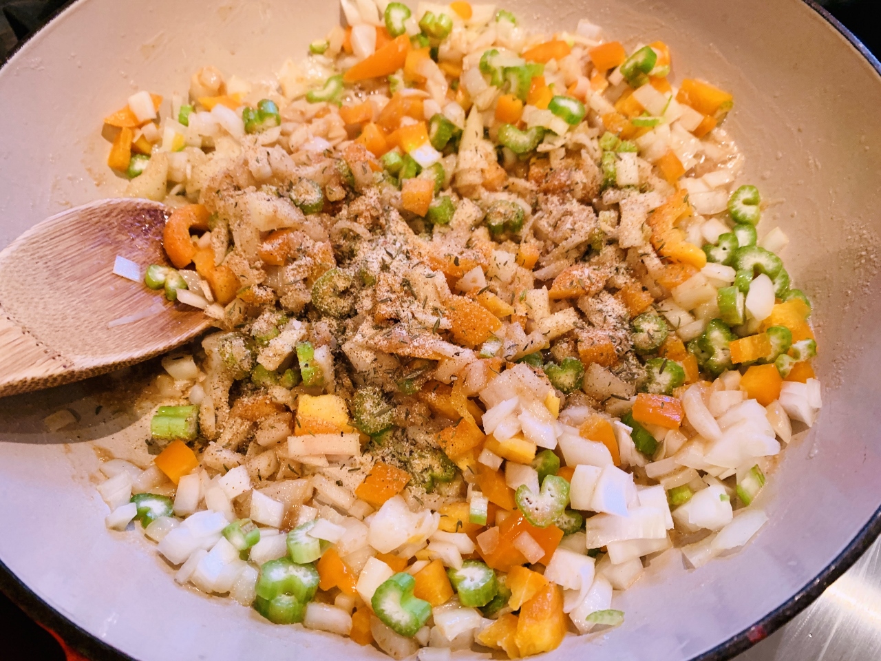 - Add onions, bell pepper and celery, stir. Turn heat back to medium, and sauté vegetables in roux for 4 minutes.