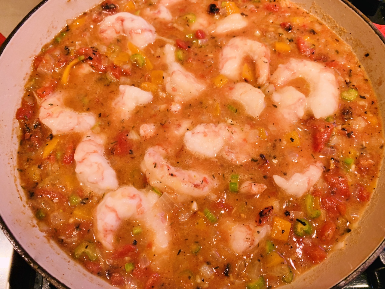 - Add garlic and creole spice mixture, and stir. Cook for 1 minute. Add tomatoes and chicken broth, stir to combine. Add frozen shrimp and place lid on pan and cook for 3 minutes. Remove lid and let sauce reduce for 4 minutes over medium-low heat.