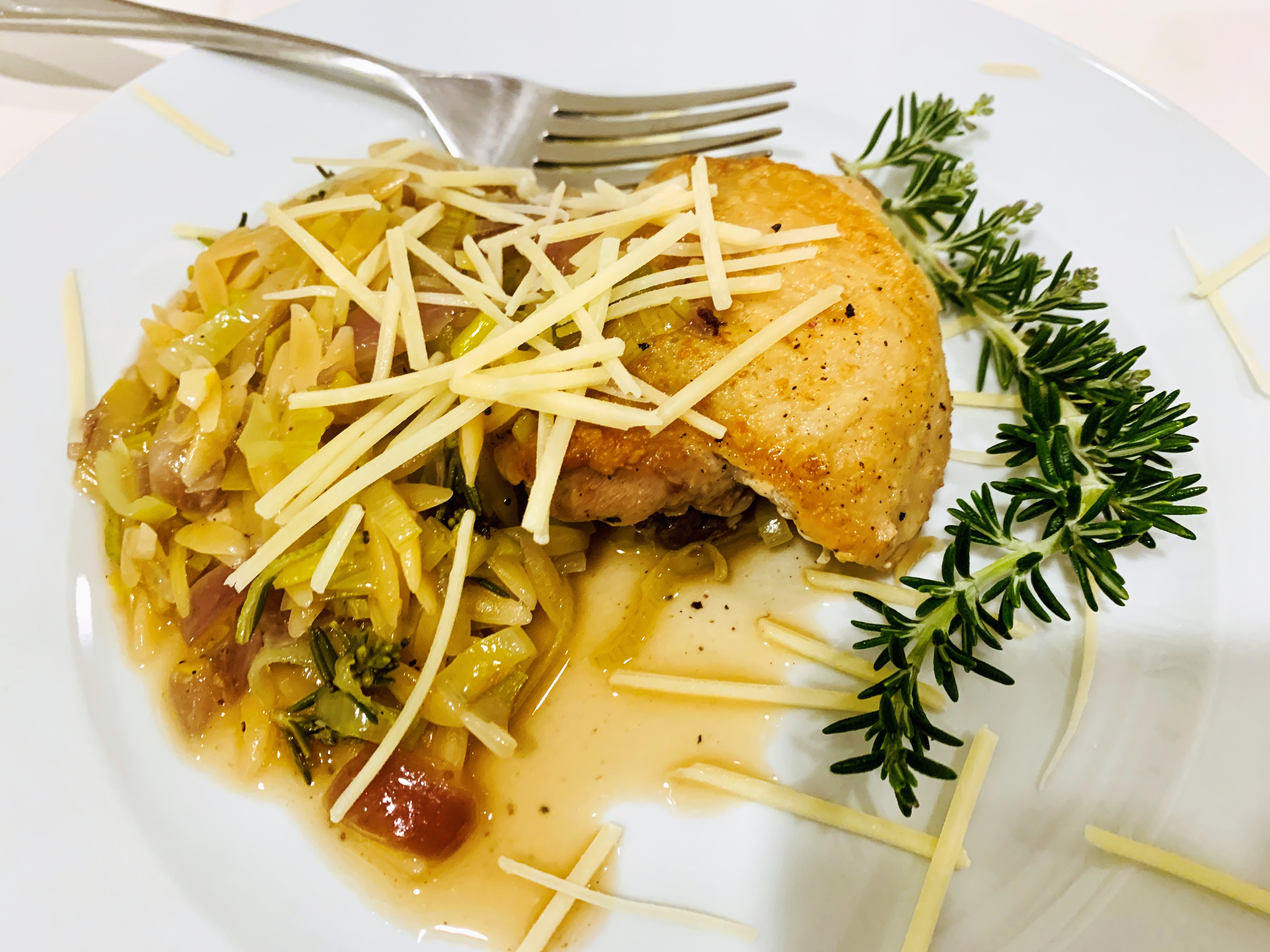 Preparing a one skillet dish on the stove top makes the simplest of dinners for during the week, and these chicken thighs with orzo, leeks and rosemary couldn’t be tastier. I made this dish for my girlfriend who was visiting and wanted to know how to put together a chicken dinner using fresh ingredients in no time at all. She’s Italian and loves her pasta, but a big bowl of noodles can sometimes get too heavy, however these tiny rice-shaped pasta are the perfect addition to a skillet dinner, giving it the right amount of chew, while still keeping it light and fresh.