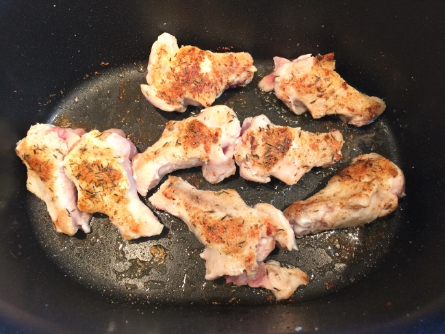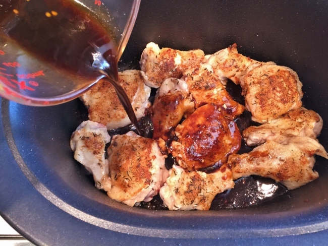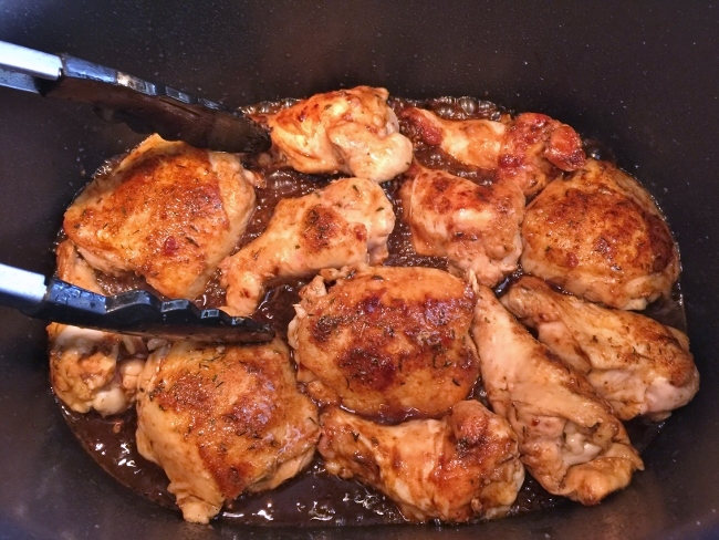 3.  With tongs, coat each piece of chicken in sauce and place it, skin-side-up in slow cooker.  Cook chicken on low for 4 hours.