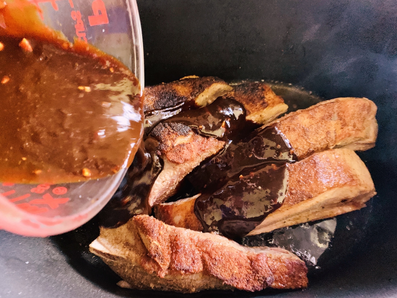 - In a measuring cup, add Hoisin, soy sauce, chili sauce, brown sugar, garlic and 1/4 cup water, whisk until combined. Pour sauce over ribs and place insert in slow cooker, or add ribs and sauce to slow-cooker. Cook for 5 hours on low heat until tender.