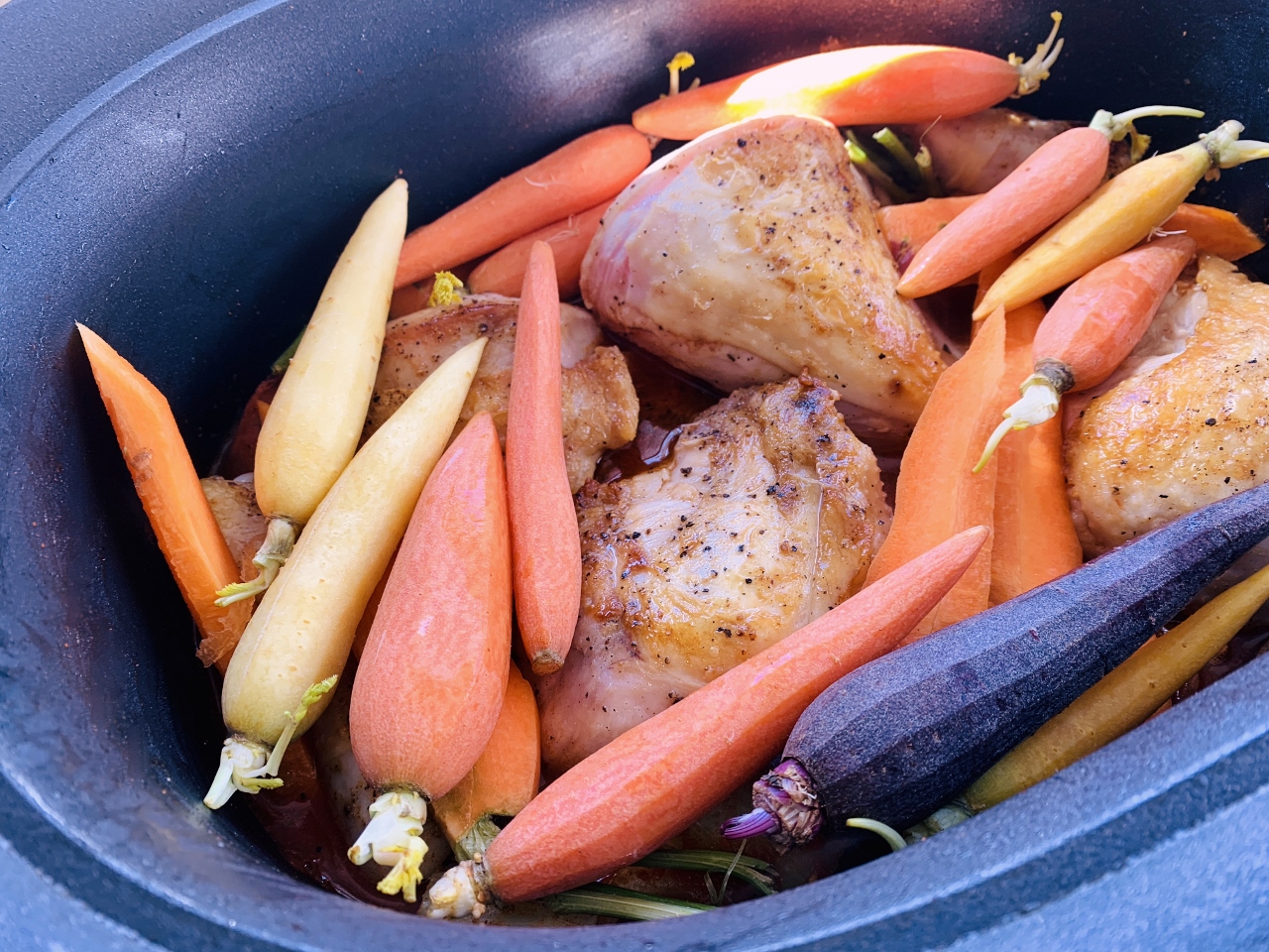 - Place chicken on top of broth. Add carrots on top of chicken. Place insert into slow-cooker and cook for 4 hours on low heat.